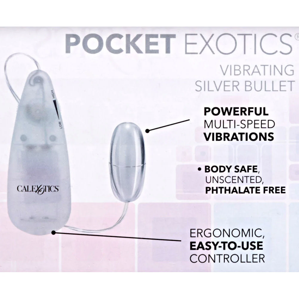 CalExotic's pretty Pocket Exotics Vibrating Silver Bullet offers the ultimate in sensual pleasure. Its curved bullet glides effortlessly over external sweet spots, stimulating, arousing and satiating desires. Its small shape fits easily between bodies for shared pleasure, or slide it along nipples, penis, perineum - any body part craving attention. With its vibrant multiple speeds and sensual shape, the sexy Pocket Exotics Vibrating Silver Bullet easily seeks out erogenous zones to massage and satisfy.